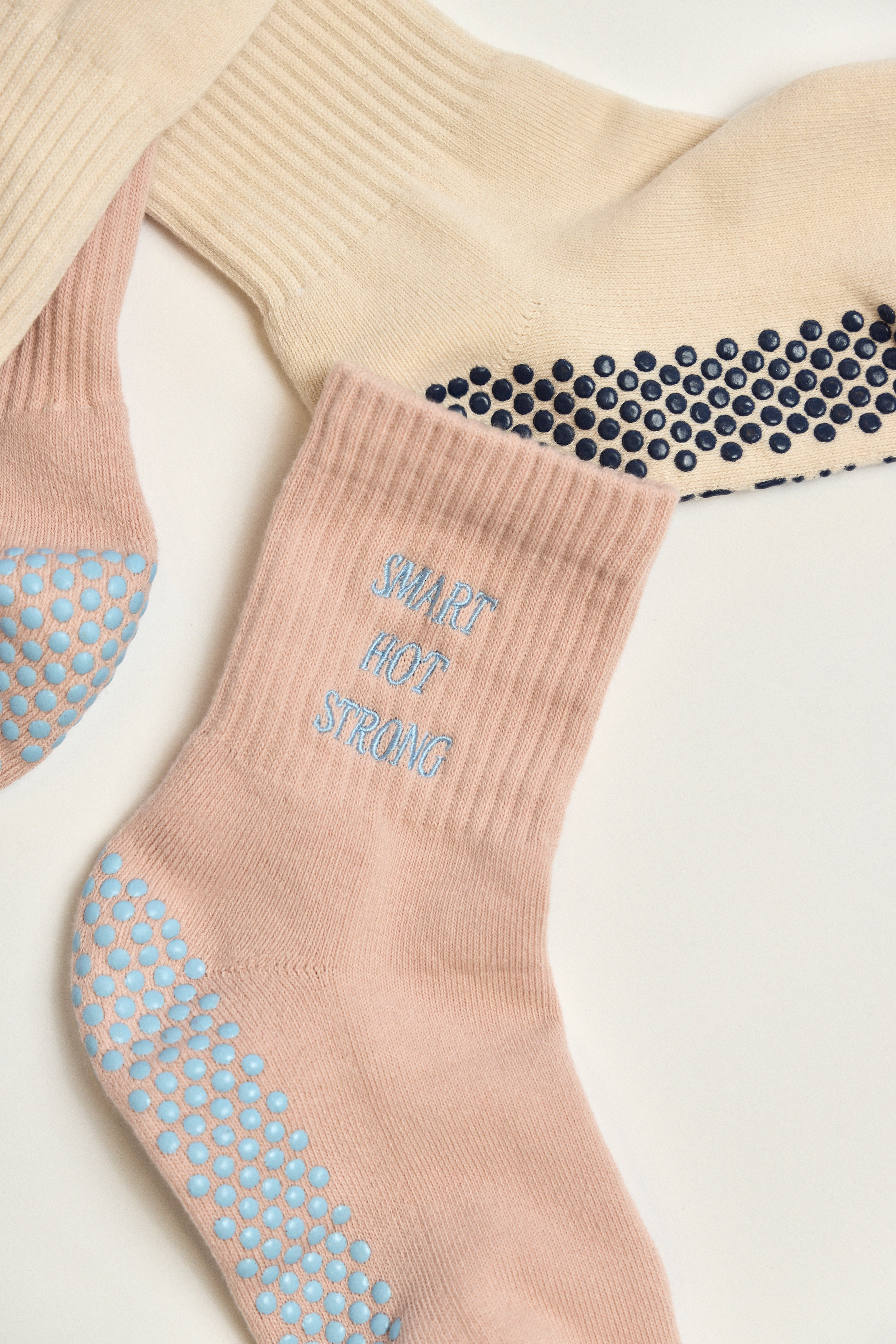 Inspired by our fan-favourite Retro Crew Grip Socks, the Smart Hot Strong Socks add a fun, stylish twist to your workout gear. With the delightful phrase "Smart Hot Strong" and our signature Club Martyn ribbed cuff, these socks will keep you steady while you stretch, bend, and move in class. Made from breathable cotton and featuring our signature "Join the Club" grip, they blend sporty vibes with a whole lot of personality.