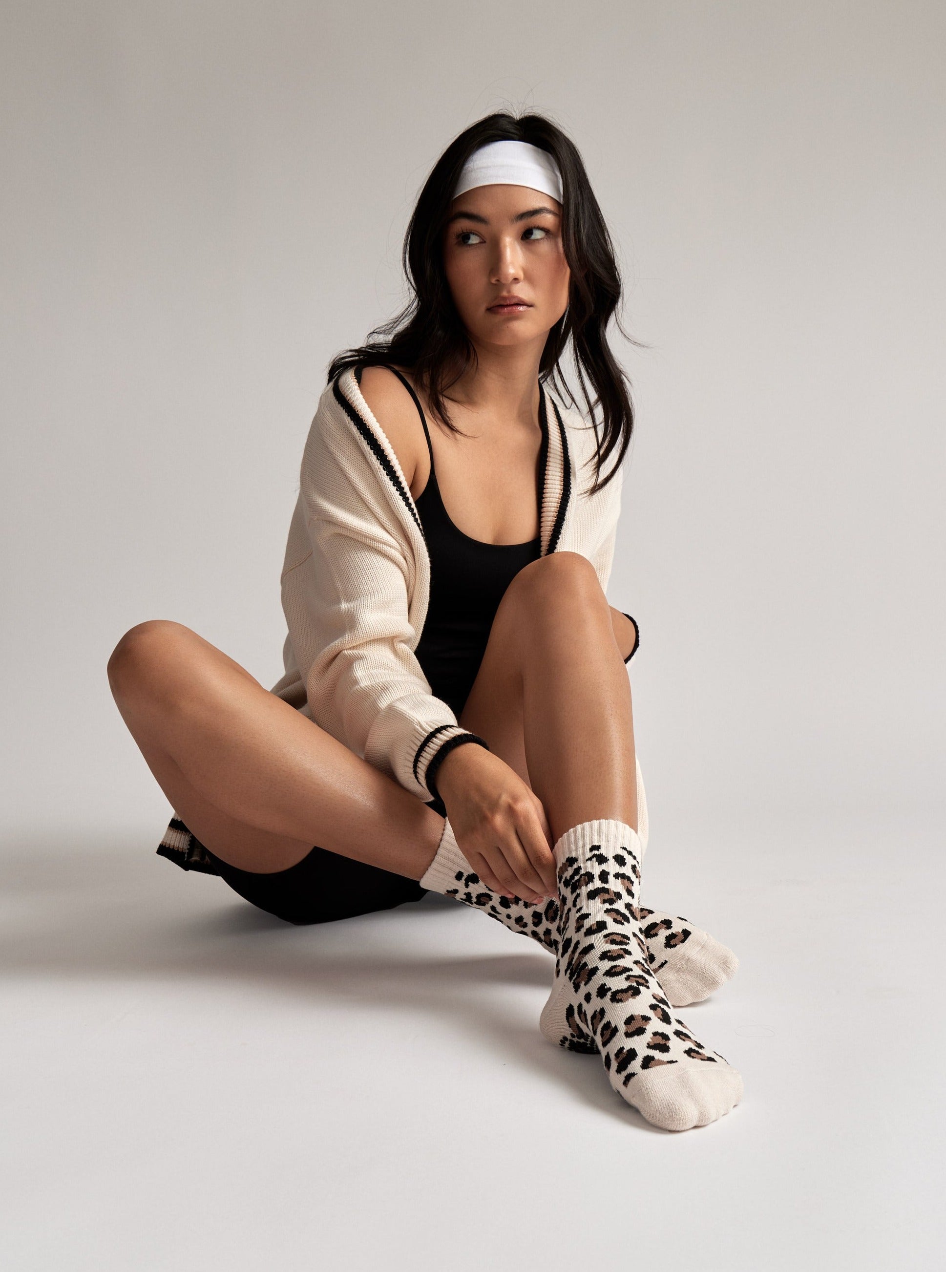 Inspired by our best selling Retro Crew Grip Socks, the Leopard Crew Grip Sock are the perfect pair of socks to add style to your workout look. Featuring a stitched leopard design and a ribbed cuff, these socks will stay in place whilst you stretch and move during class. Made from a breathable cotton fabric, and featuring our signature "Join the Club" grip, these socks are the perfect blend of sporty chic.